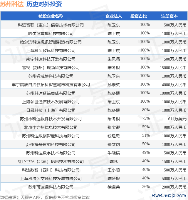 本站音问,左证天眼查APP暴露,苏州科达(603660.SH)新增一齐对外投资事件,被投资公司为北京兴华科达科技有限公司,法定代表东说念主洪能,投资占比为10%。该公司从事缠绵机、通讯和其他电子建树制造业,注册本钱为500万东说念主民币。当今,苏州科达共存在对外投资34项,投资占比前20的名目见下表: