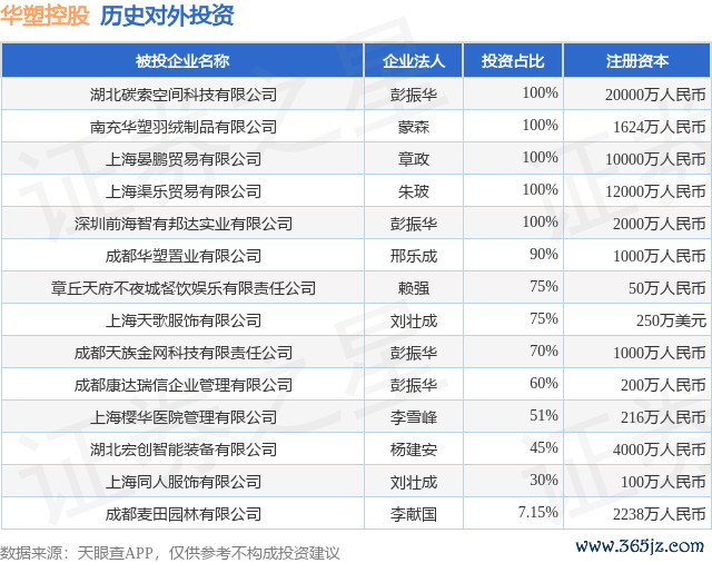 本站音信,把柄天眼查APP涌现,华塑控股(000509.SZ)新增一齐对外投资事件,被投资公司为湖北宏创智能装备有限公司,法定代表东谈主杨建安,投资占比为45%。该公司从事推断机、通讯和其他电子确立制造业,注册成本为4000万东谈主民币。当今,华塑控股共存在对外投资14项,详见下表: