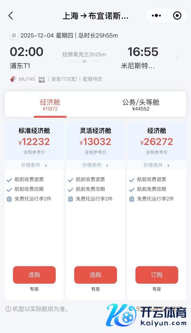 12月5日返程航班信息露馅,MU746航班当地时分凌晨2点从布宜诺斯艾利斯腾飞,抵达上海为第二天当地时分下昼6点,经停奥克兰,翱游时长29小时,经济舱机票12437元起,公事舱45287元起。